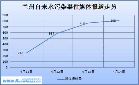 【导读】2014年4月10日,兰州发生自来水苯含量超标事件,媒体报道后立即在网上引起强力反响,各路媒体纷纷跟踪报道,吸引大批网友的关注和舆论。随着舆论和媒体对兰州政府水污染事件处置的各种质疑和谴责,兰州自来水污染事件不断升级发酵,话题热点呈上升趋势。