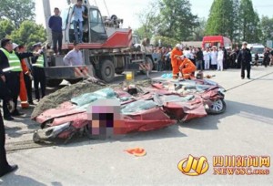4月12日上午9时10分许,在温江区金马镇刘杆路发生一起惨烈车祸,目击者称一辆行驶中的红色大货车侧翻,压住了一辆行驶中的红色小车,大货车上的河沙散落一地,红色小车整体被大货车压得高度仅剩40厘米。车祸发生瞬间,一名环卫工人也被撞伤。温江警方调查称,车祸导致红色小车内的一男一女死亡,车祸原因尚在调查中。