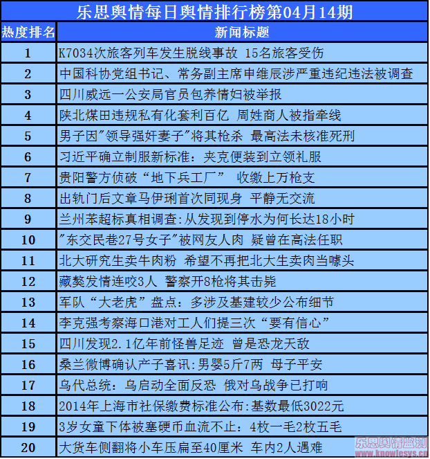 2014年4月14日乐思每日舆情热点排行榜导读:K7034次旅客列车发生脱线事故 15名旅客受伤;中国科协党组书记、常务副主席申维辰涉严重违纪违法被调查;四川威远一公安局官员包养情妇被举报;陕北煤田违规私有化套利百亿 周姓商人被指牵线;男子因”领导强奸妻子”将其枪杀 最高法未核准死刑……