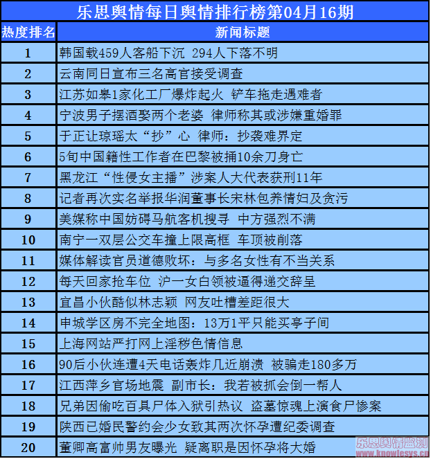 2014年4月16日乐思每日舆情热点排行榜导读:韩国载459人客船下沉 294人下落不明;云南同日宣布三名高官接受调查;江苏如皋1家化工厂爆炸起火 铲车拖走遇难者;宁波男子摆酒娶两个老婆 律师称其或涉嫌重婚罪;于正让琼瑶太“抄”心 律师:抄袭难界定……