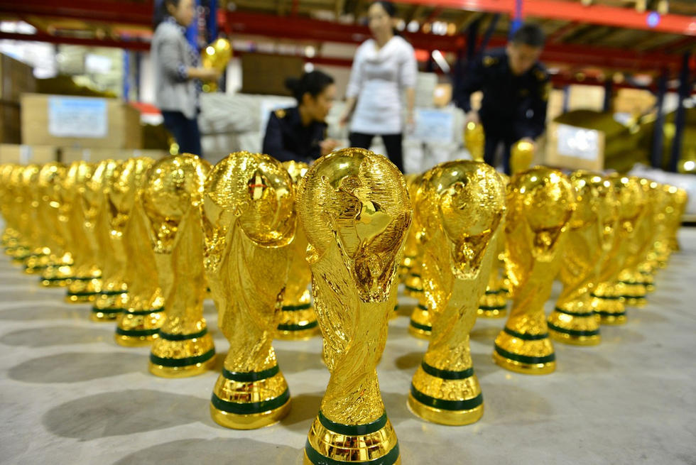 巴西世界杯开赛在即,市场上体育用品侵权的情况也逐渐增多。4月16日下午,浙江义乌海关对最近查获的1020尊未获得国际足联授权的“大力神杯”进行清点暂扣。经权利人确认,侵犯了世界杯知识产权,已依法立案。图为海关人员对“大力神杯”进行清点。