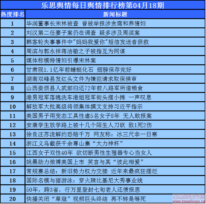 乐思每日舆情排行榜第04-18期:模特情妇引爆宋林案