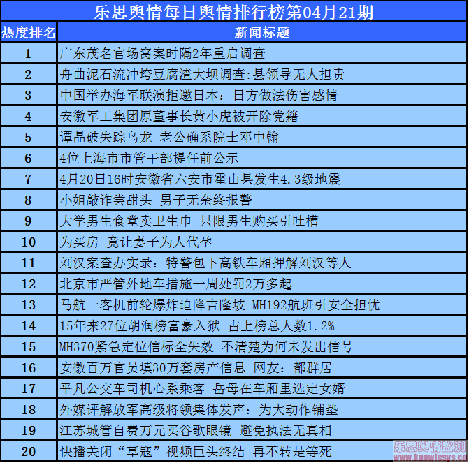 2014年4月21日乐思每日舆情热点排行榜导读:北京国际车展门禁卡炒到700元;广东茂名官场窝案时隔2年重启调查;舟曲泥石流冲垮豆腐渣大坝调查:县领导无人担责;中国举办海军联演拒邀日本:日方做法伤害感情;安徽军工集团原董事长黄小虎被开除党籍……