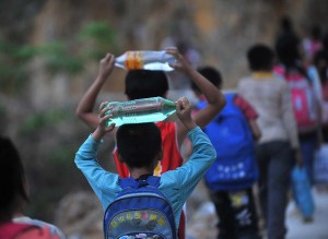 广西凌云县伶站瑶族乡浩坤村弄新小学位于大石山区深处,自然环境恶劣,由于学校附近没有水源,很多时候学校生活用水需要购买或是靠县里有关部门送水,学校一年至少花费四五千元用来买水。每个学生每天从学校取一瓶水用于淘米洗碗、刷牙洗脸,学生们在校寄宿时无法洗澡洗衣服。另外,很多学生每周一从家里自带一两瓶水作为一个星期寄宿生活的饮用水。