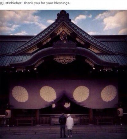 4月23日,有网友晒出两张贾斯丁比伯在日本靖国神社前的照片,并写道:“Thank you for your blessings!(感谢你的祝福或保佑!)”。有网友称“深深地为其智商感到焦虑”,也有网友称比伯“花样作死冠军”。据悉,目前比伯已经删除了照片。
