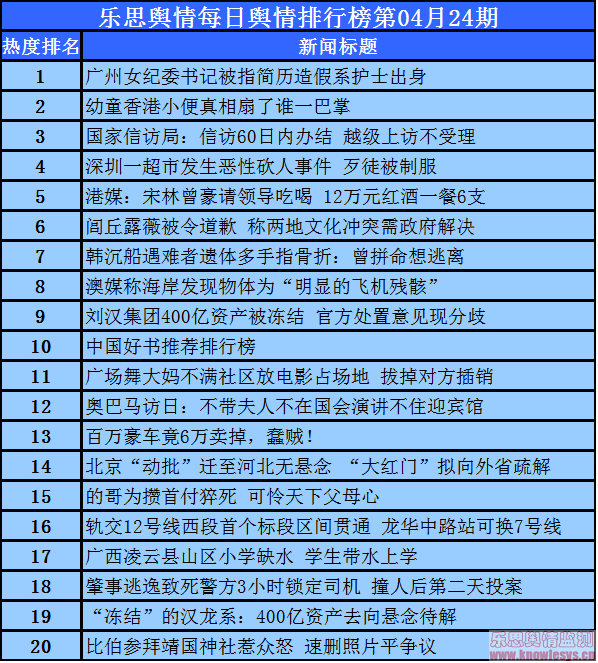 2014年4月24日乐思每日舆情热点排行榜导读:广州女纪委书记被指简历造假系护士出身;幼童香港小便真相扇了谁一巴掌;国家信访局:信访60日内办结 越级上访不受理;深圳一超市发生恶性砍人事件 歹徒被制服;港媒:宋林曾豪请领导吃喝 12万元红酒一餐6支……