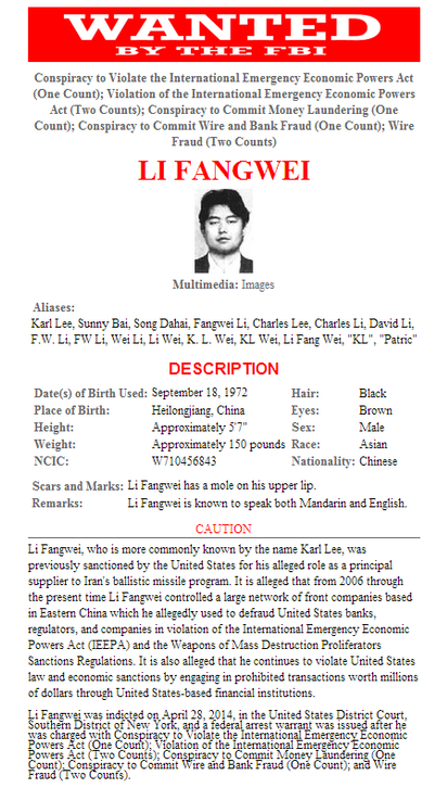 5、美国政府悬赏500万美元缉拿中国军火商李方伟