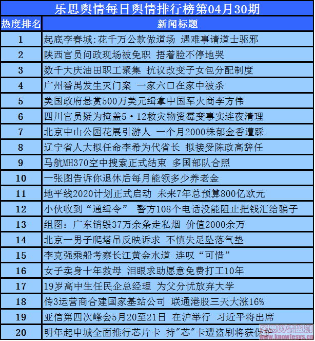 2014年4月30日乐思每日舆情热点排行榜导读:起底李春城:花千万公款做道场 遇难事请道士驱邪;陕西官员问政现场被免职 捂着脸不停地哭;数千大庆油田职工聚集 抗议改变子女包分配制度;广州番禺发生灭门案 一家六口在家中被杀;美国政府悬赏500万美元缉拿中国军火商李方伟……