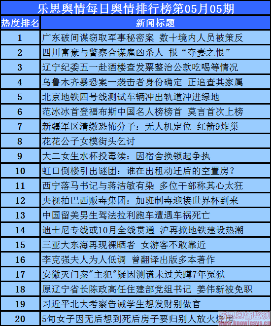 2014年5月5日乐思每日舆情热点排行榜导读:广东破间谍窃取军事秘密案 数十境内人员被策反;四川富豪与警察合谋雇凶杀人 报“夺妻之恨”;辽宁纪委五一赴酒楼查发票整治公款吃喝等情况;乌鲁木齐暴恐案一袭击者身份确定 正追查其家属;北京地铁四号线测试车辆冲出轨道冲进绿地……