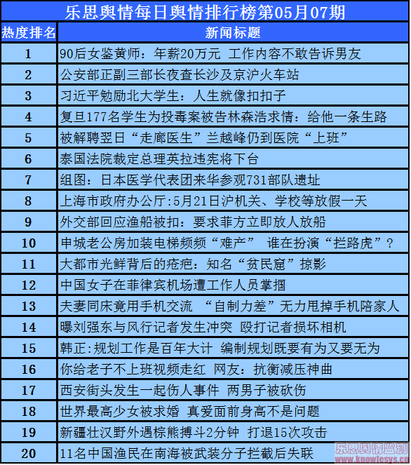 2014年5月7日乐思每日舆情热点排行榜导读:90后女鉴黄师:年薪20万元 工作内容不敢告诉男友;公安部正副三部长夜查长沙及京沪火车站;习近平勉励北大学生:人生就像扣扣子;复旦177名学生为投毒案被告林森浩求情:给他一条生路;被解聘翌日“走廊医生”兰越峰仍到医院“上班”……