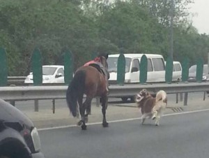 昨天,一匹马和一条狗成了北五环的“主角”。10日上午10点左右,一匹戴着马鞍的马“溜达”上北京五环,虽然主人在后面狂追,众多私家车主试图将其别住,但均因马儿跑得太欢而无果。就在众人一筹莫展之时,一位看热闹车主的爱犬“看不下去了”,它从车内蹿出后直接冲向这匹马。北京五环上,一马一狗在前面跑,两位主人在后面狂追,最终在众多私家车主的帮助下,这匹马被截停,这条狗也被主人抱走。