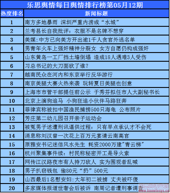 2014年5月12日乐思每日舆情热点排行榜导读:南方多地暴雨 深圳严重内涝成“水城”;兰考县长自我批评:衣服不是名牌不想穿;美媒:中方已向美方开出逾1千人贪官外逃名单;男青年火车上强奸精神分裂女 女方自愿仍构成强奸;山东黄岛一工厂挡土墙倒塌 造成18人遇难3人受伤……