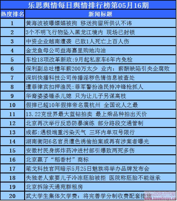 2014年5月16日乐思每日舆情热点排行榜导读:黄海波被曝嫖娼被拘 移送拘留所供认不讳;3个不明飞行物坠入黑龙江境内 现场已封锁;中资企业越南遭袭 已致1人死亡上百人伤;金龙鱼母公司益海嘉里购地沟油;车检18项改革新政:9月起私家车6年内免检……
