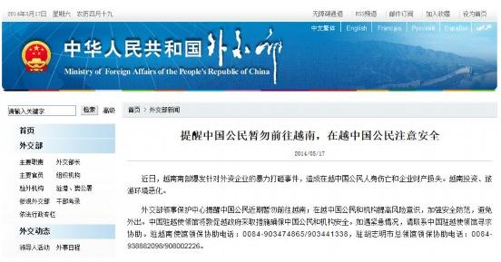外交部发言人洪磊表示,自今年5月13日起,越南多地发生打砸抢烧外国企业的严重暴力事件,造成中国公民伤亡和财产损失,破坏了中越交流与合作的气氛和条件。为此,中方从即日起已提升中国公民赴越旅游安全提示级别,调整为“暂勿前往”,并暂停部分双边交往计划。