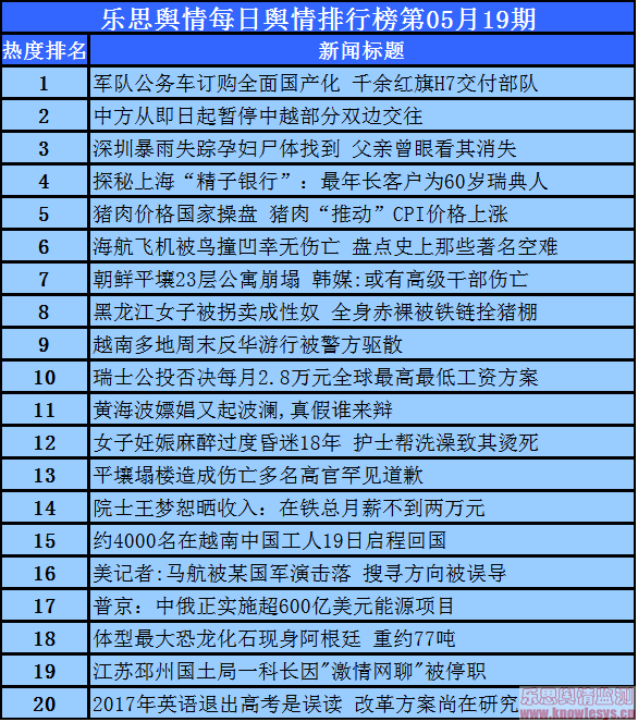 2014年5月19日乐思每日舆情热点排行榜导读:军队公务车订购全面国产化 千余红旗H7交付部队;中方从即日起暂停中越部分双边交往;深圳暴雨失踪孕妇尸体找到 父亲曾眼看其消失;探秘上海“精子银行”:最年长客户为60岁瑞典人;猪肉价格国家操盘 猪肉“推动”CPI价格上涨……