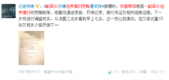 @ 记者柯南:#副县长涉嫌包养情妇受贿遭举报#接爆料,安徽阜阳某县一副县长包养情妇收受贿赂等,刚看完通话录音、开房记录、银行凭证及相关链接证据,下一步将进行调查核实。从凌晨三点多看到早上七点,这一夜让我激动,但又很沉重!不知又有多少官员倒下。。。