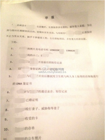 在记者柯南发布的微博中,还附有一张疑似举报人提供的书面材料的照片,这份材料中写道:“阜南县某副县长生活糜烂,长期包养多名情妇,破坏他人家庭,为达到与情妇长期姘居的目的,给情妇买车买房,与阜阳市血站一女性长期保持不正当男女关系,插手干涉建设工地,左右招标项目,并有重大经济问题。”