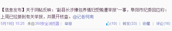 @ 阜阳发布:【信息发布】关于网帖反映:“副县长涉嫌包养情妇受贿遭举报”一事,阜阳市纪委回应称:上周已经接到有关举报,并展开核查。@记者柯南