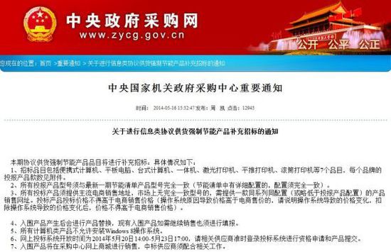 中央国家机关政府采购中心在5月16日发布一份通知,对入围中央机关采购范围内的信息类产品提出新的采购要求,其中要求所有计算机类产品不允许安装Windows 8操作系统。