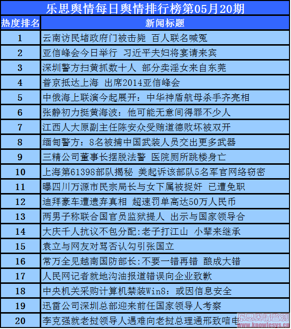 2014年5月20日乐思每日舆情热点排行榜导读:云南访民堵政府门被击毙 百人联名喊冤;亚信峰会今日举行 习近平夫妇将宴请来宾;深圳警方扫黄抓数十人 部分卖淫女来自东莞;普京抵达上海 出席2014亚信峰会;中俄海上联演今起展开:中华神盾航母杀手齐亮相……
