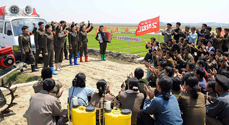 朝鲜今年雨水过少,全国很多地区都发生干旱。朝鲜近日举国上下总动员为五月底完成插秧工作而努力。朝鲜文艺宣传队走进田间地头积极支援农业生产,以保证今年的国内粮食供给。文艺工作者也走到农场中去,站在田间地头热情高歌,为辛苦耕种的劳动者加油鼓劲。收到田间百姓的热情欢迎和极高的评价。