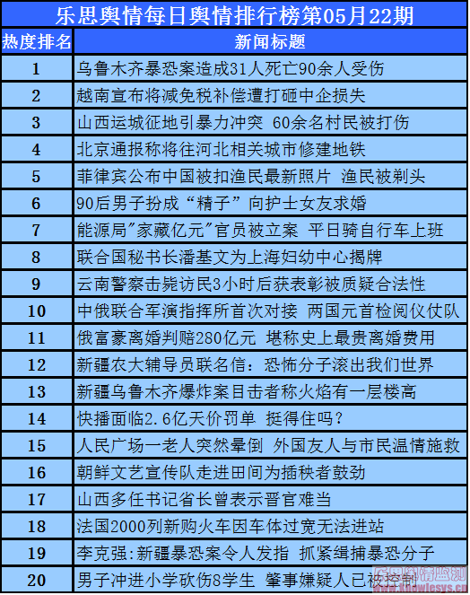 2014年5月22日乐思每日舆情热点排行榜导读:乌鲁木齐暴恐案造成31人死亡90余人受伤;越南宣布将减免税补偿遭打砸中企损失;山西运城征地引暴力冲突 60余名村民被打伤;北京通报称将往河北相关城市修建地铁;菲律宾公布中国被扣渔民最新照片 渔民被剃头……