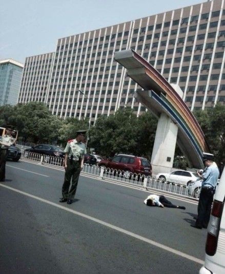 6月5日上午11点,北京建国门桥西侧,内侧车道一无牌照黑色奥迪车将一交警撞飞,交警被撞出10米开外,趴在地上一动不动,浑身是血。长安街已封锁两条内侧车道处理突发情况,警车、救护车、大量武警已赶到现场处理。