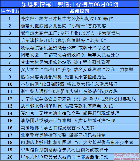 2014年6月6日乐思每日舆情热点排行榜导读:外交部:越方已冲撞中方公务船超过1200艘次;杨幂刘恺威抱女儿出院 “小糯米”首露真容;亚洲最大高考工厂:今年毕业1.3万人 多为复读生;哈尔滨松花江畔出现涉色情服务“老头乐”;疑似马航客机坠毁噪音公布 或解开失踪之谜……