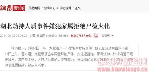 6月12日,舆论对“湖北潜江校园劫持案”关注度依旧保持在高热态势。当天各路媒体转载“北京青年报”《湖北校园绑架案凶犯家属拒绝尸检火化》的报道再次成为舆论热议焦点。据称,11日两名工作人员通知张泽清的妻女去殡仪馆,希望其签字同意解剖、火化尸体,但均遭到家属拒绝。家属认为,他们靠种地为生,张泽清的眼睛和耳朵残疾,但没有低保,也没有享受国家其他福利保障。张的本意并非针对学生和老师,不过是想借此事要挟政府,解决他的诉求。对于张制造炸药、手枪的说法,家属和邻居也有不同看法,他们认为张泽清制造的那些都是假的,没有威力。