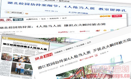 6月11日,在舆论大肆宣扬潜江校园劫持案中4人抢当人质的正能量时,有媒体曝光“嫌疑犯死前诉说冤情”的消息引起不少媒体的关注和转载报道。11日9时30分,“光明网教育频道”以《湖北校园劫持案嫌犯被击毙前不停诉说冤情》为题的报道备受舆论关注,该报道先后被中国青年网、凤凰网、中国江苏网、新浪网、网易等众多主流门户媒体转载。这一案件细节的曝光立即引起舆论的迅速暴涨,舆论议题被部分转移到对嫌疑人作案动机背后的不公问题关注上。