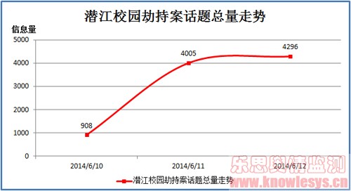 统计乐思网络舆情监测系统连续三天对“湖北潜江校园劫持案”话题专题监测数据,截至12日12时,该话题网上舆情信息曝光总量达9209条,话题舆情热度走势在事件发生后两天时间内维持在较高态势。从话题曝光量走势图可知,“湖北潜江校园劫持案”经荆楚网报道后,立即在网上传播开来,当天事件报道量达908条,随后在11日出现暴涨,话题曝光量翻了近5被,达4005条。12日,话题曝光量依然保持上升态势,话题曝光量达4296条,但总体趋向平稳。