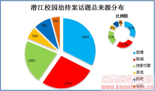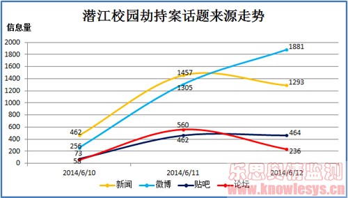 从“湖北潜江校园劫持案”的话题来源来看,在该事件整个舆情发展过程中,微博、新闻成为舆论报道议论的主要平台。截至12日12时,该话题微博一级传播量达2984条,新闻报道量为2512篇,微博和媒体话题曝光量占到总话题量的59%。其中新华网、人民网、扬子晚报网、中国日报、中国教育、东方早报网、中国警察网、凤凰网、腾讯、网易、新浪、搜狐等多家主流媒体网站报道和转载了此事。@人民日报、@人民网、@新民周刊、@南方都市报、@财经网、@21世纪经济报道、@新浪评论、@网易新闻、@湖北日报、@荆楚网 等热门媒体微博关注和转发了此事。