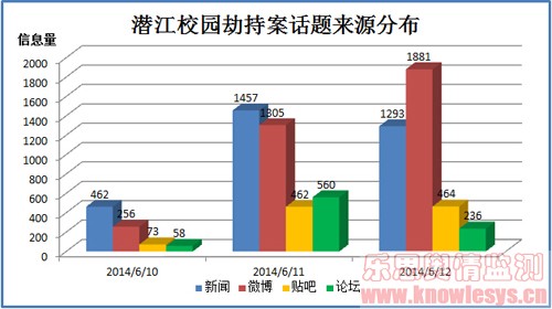 分析“湖北潜江校园劫持案”话题来源走势情况可知,在整个事件的舆情发展态势中,新闻媒体和微博一直是该案件话题议论的主要阵地,其舆情推动作用优势明显,特别是新闻在案件前期的细节报道中成主流。而随着案件细节的逐步明朗,公众参与度逐步上升,微博、贴吧话题议论地位凸显出来,而媒体和论坛的参与度纵向相比出现下滑,微博舆情热度依旧强劲。
