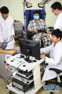 天津,2014年6月14日 “纯意念控制”人工神经康复机器人问世 6月14日,技术人员在指导因中风偏瘫的董姓患者使用“神工一号”。当日,“纯意念控制”人工神经康复机器人“神工一号”系统新闻发布会在天津市人民医院举行。这一历时10年的技术,是国家“863计划”“十二五”国家科技支撑计划和国家优秀青年科学基金重点支持项目,在复合想象动作信息解析与处理、异步脑—机接口训练与识别、皮层—肌肉活动同步耦合优化、中风后抑郁脑电非线性特征提取与筛查等关键技术上取得了重大突破,目前已拥有包括23项授权国家发明专利、1项软件著作权在内的自主知识产权集群,是适用于全肢体中风康复的“纯意念控制”人工神经机器人系统。