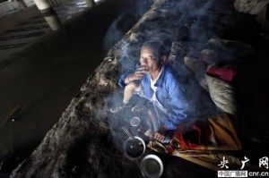 在宁波一处桥洞下,过往的车辆卷起了尘埃,路人无不掩鼻而行,匆匆离开。而在桥洞上方,一位光着上身、皮肤黝黑的老汉却怡然自得,吃着鸡块、喝着老酒,吸引让过往路人驻足观看。
