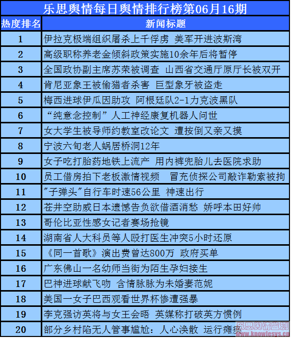 2014年6月16日乐思每日舆情热点排行榜导读:伊拉克极端组织屠杀上千俘虏 美军开进波斯湾;高级职称养老金倾斜政策实施10余年后将暂停;全国政协副主席苏荣被调查 山西省交通厅原厅长被双开;肯尼亚象王被偷猎者杀害 巨型象牙被盗走;梅西进球伊瓜因助攻 阿根廷队2-1力克波黑队……