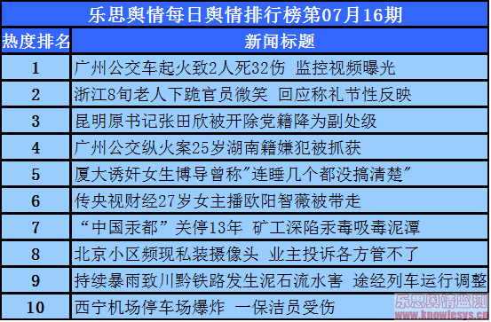 2014年7月16日乐思每日舆情热点排行榜导读:广州公交车起火致2人死32伤 监控视频曝光;浙江8旬老人下跪官员微笑 回应称礼节性反映;昆明原书记张田欣被开除党籍降为副处级;广州公交纵火案25岁湖南籍嫌犯被抓获;厦大诱奸女生博导曾称”连睡几个都没搞清楚”……