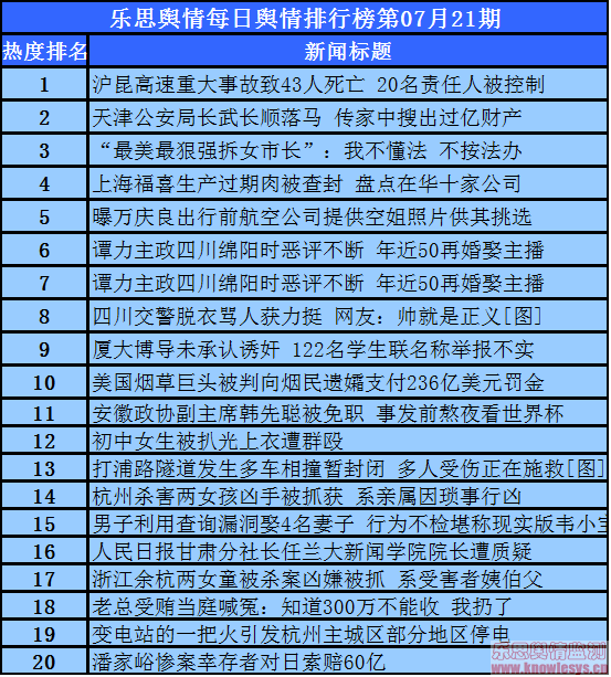 2014年7月21日乐思每日舆情热点排行榜导读:沪昆高速重大事故致43人死亡 20名责任人被控制;天津公安局长武长顺落马 传家中搜出过亿财产;“最美最狠强拆女市长”:我不懂法 不按法办;上海福喜生产过期肉被查封 盘点在华十家公司;曝万庆良出行前航空公司提供空姐照片供其挑选……