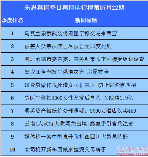 2014年7月22日乐思每日舆情热点排行榜导读:乌克兰亲俄武装将黑匣子移交马来西亚;被害人父亲法院自尽被告无罪变死刑;河北承德市委常委、常务副市长李刚接受组织调查;黑龙江伊春发生洪涝灾害 房屋被淹;碰瓷男做作找死遭女司机直压……