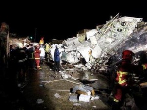 台湾复兴航空一班由高雄飞往澎湖马公的GE222航班23日晚间7时许坠毁在澎湖县湖西乡西溪村的民宅,机上58人中有48人罹难10人重伤,台湾《中国时报》24日报道说,这起空难为台湾近12年来最重大的坠机事件。图为失事现场一片狼藉,令人怵目惊心。