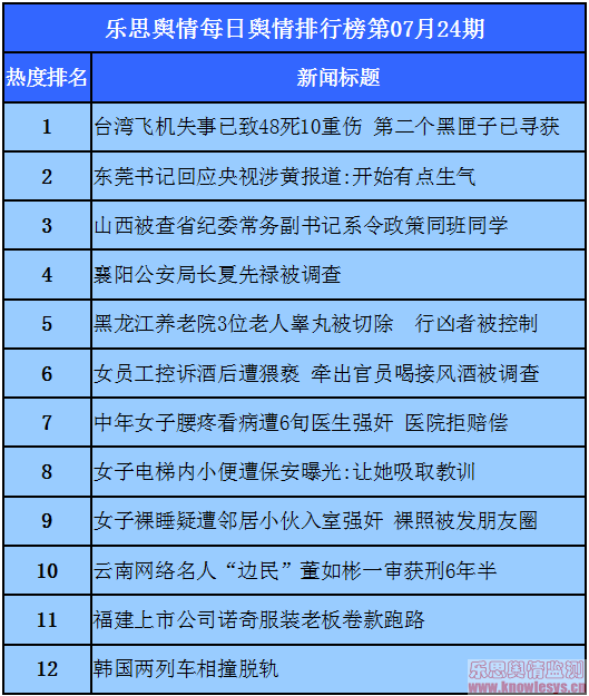 014年7月24日乐思每日舆情热点排行榜导读:台湾飞机失事已致48死10重伤 第二个黑匣子已寻获;东莞书记回应央视涉黄报道:开始有点生气;山西被查省纪委常务副书记系令政策同班同学;襄阳公安局长夏先禄被调查;黑龙江养老院3位老人睾丸被切除 行凶者被控制……