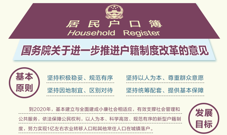 7月30日,国新办召开新闻发布会,公布《关于进一步推进户籍制度改革的意见》,提出建立城乡统一的户口登记制度。《意见》明确,我国将逐步取消农业户口与非农业户口性质区分,统一登记为居民户口。这标志实行了半个多世纪的“农业”和“非农业”二元户籍管理模式将退出历史舞台。