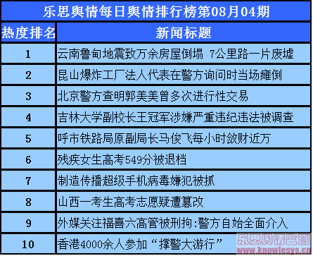 2014年8月4日乐思每日舆情热点排行榜导读:云南鲁甸地震致万余房屋倒塌 7公里路一片废墟;昆山爆炸工厂法人代表在警方询问时当场瘫倒;北京警方查明郭美美曾多次进行性交易;吉林大学副校长王冠军涉嫌严重违纪违法被调查;呼市铁路局原副局长马俊飞每小时敛财近万……