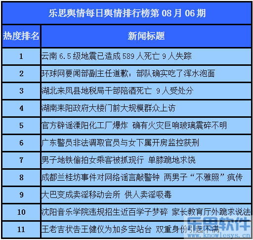 014年8月6日乐思每日舆情热点排行榜导读:云南6.5级地震已造成589人死亡9人失踪;环球网要闻部副主任道歉:部队确实吃了浑水泡面;湖北来凤县地税局干部陪酒死亡 9人受处分;湖南耒阳政府大楼门前大规模群众上访;官方辟谣溧阳化工厂爆炸 确有火灾巨响玻璃震碎不明……