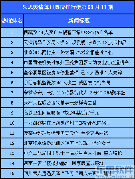 2014年8月11日乐思每日舆情热点排行榜导读:西藏致44人死亡车祸暂不集中公布伤亡名单;天津落马公安局长拥35项发明 被查抄12皮卡物品;北京河北两村庄一路之隔 养老金相差近7倍;中国司法机关对柳州正菱集团廖荣纳发出红色通缉令;皇帝洞景区被责令停业整顿 已4人遇难1人失踪……