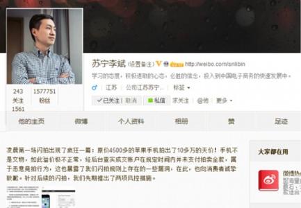 今日凌晨0点,备受网友期待的苏宁易购“0元闪拍”活动出现疯狂一幕:一款原价为4518元的深空灰苹果手机iPhone5S (16GB)竟然拍出136100元的天价,这让不少网友唏嘘不已。对此,苏宁云商集团运营总部执行副总裁李斌连夜通过微博发出《关于闪拍出现恶意竞拍的处理公告》(以下简称:公告),向网友表达歉意的同时,宣传将紧急出台两项风控措施,防止类似恶意竞拍的情况发生。