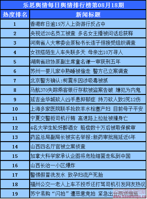 2014年8月18日乐思每日舆情热点排行榜导读:香港昨日逾19万人上街游行反占中;央视近20名员工被查 多名女主播被问话后获释;河南省人大常委会原秘书长连子恒接受组织调查;女孩搭陌生人车失联多天 母亲出10万寻人;湖南省政协原副主席童名谦一审获刑五年……