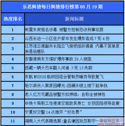 2014年8月19日乐思每日舆情热点排行榜导读:柯震东房祖名涉毒 被警方控制恐涉刑事犯罪;山西长治一小区住户家中发生爆炸造成7死4伤;江苏连云港副市长陆云飞接受组织调查 内幕不简单原来是站错队;安徽淮南东方煤矿爆炸事故29人被困;西藏一辆大巴车翻入河道 3死13失踪……