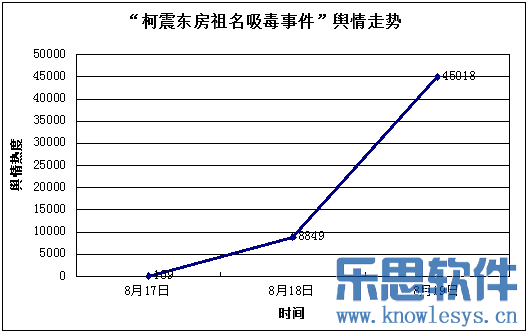 从“柯震东房祖名吸毒事件”舆情走势图中可以看出,8月17日晚,网上开始流传“柯震东吸毒”,是真是假还无从得知,因此舆情热度较低,但也开始升温,同时房祖名也牵涉其中的消息也流传开来;8月18日,各方媒体开始打探真实情况,而网友也议论纷纷,事件舆情热度开始加速度上升,之后陆续有媒体证实“柯震东房祖名吸毒事件”属实,18日晚,北京警方官方微博@平安北京发布通告证实情况属实,同时公布案件相关细节,而两明星所属经纪公司也随之发声明致歉后,事件舆情热度急速上升,到19日后,不管是媒体还是网友都纷纷对事件进行分析和解读。