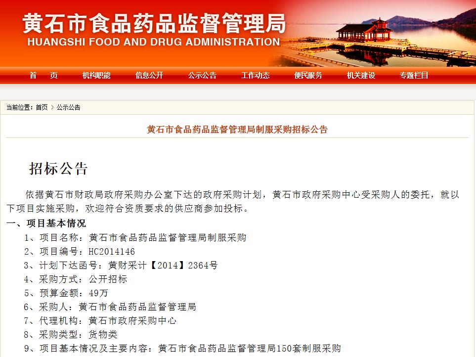 日前,湖北当地论坛出现一条爆料帖引发网友热议。爆料人称,黄石市食品药品监督管理局发布招标公告,以49万元的预算采购150套制服,平均每套3266元。随后,多家媒体报道了“湖北黄石食药监局49万采购150套制服被疑天价”一事。不少网友对制服价格表示质疑,纷纷要求黄石市食药监管局进行说明。
